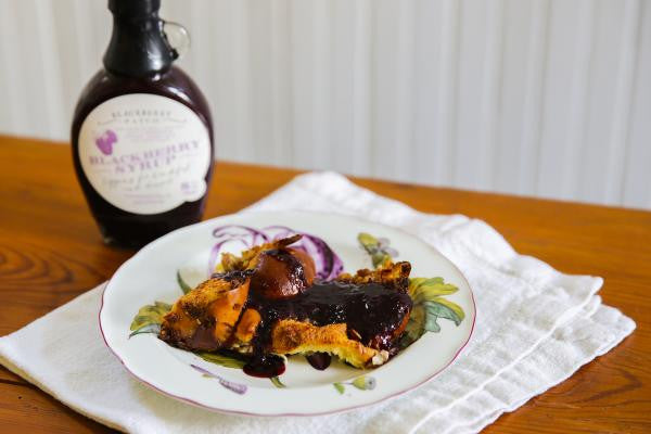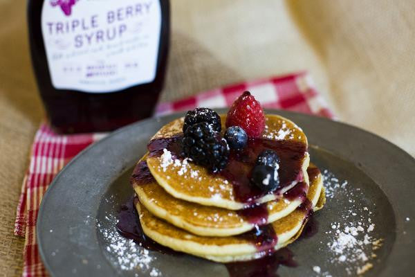 Cook until golden.Top with confectioners sugar, blueberries, and Triple Berry Syrup.