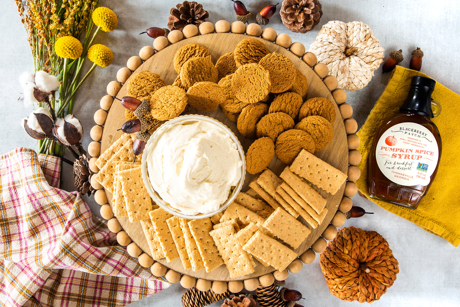 In a medium bowl, mix softened cream cheese with Pumpkin Spice Syrup until you have the flavor and color you desire - remember that the flavor will be diluted a little when you add the whipped cream. In a separate bowl whip heavy cream until you have whipped cream consistency. Fold together with the cream cheese. Put in a serving dish along with edible dippers like ginger snaps and graham crackers.