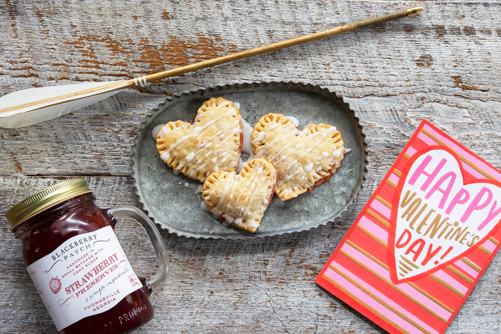 2. Place one layer of heart shaped pie shell on the counter. Spread strawberry jam and a few pieces of diced strawberries on top of the heart. Place another layer of pie shell on top and crimp the edges with the prongs of a fork.