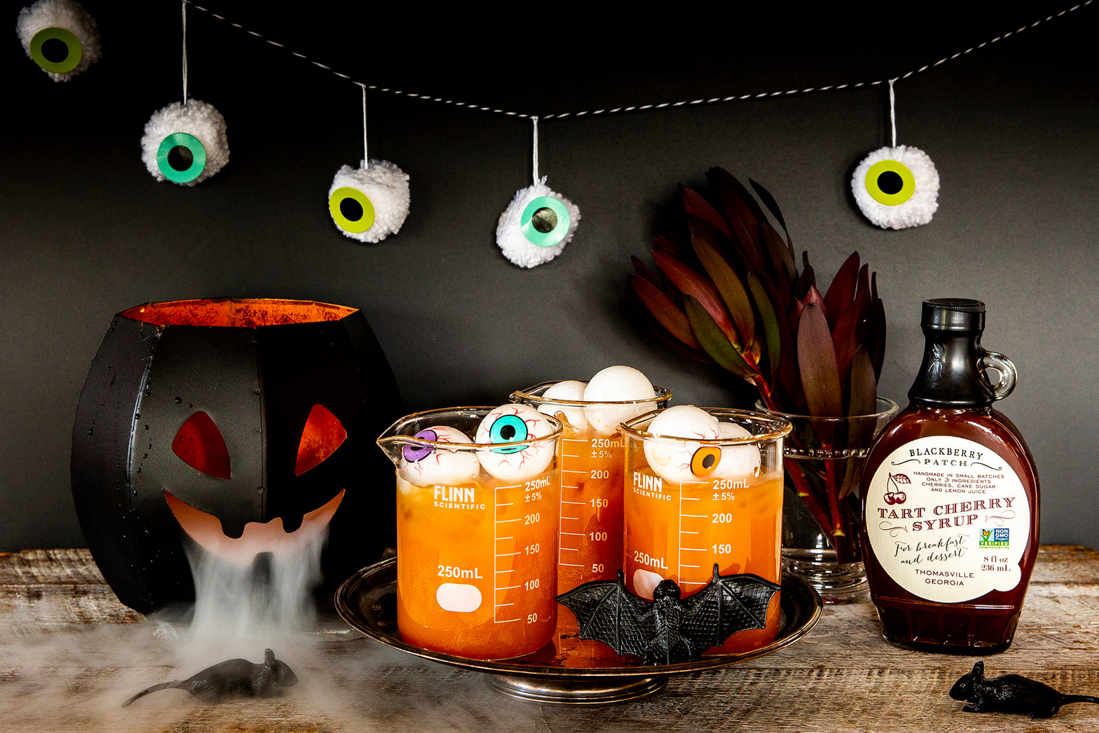 Stir together in a large pitcher and serve over ice. This recipe is great anytime, but especially fun for Halloween! Have fun with this - we even played with dry ice and served out of beakers to step up the SPOOKINESS!