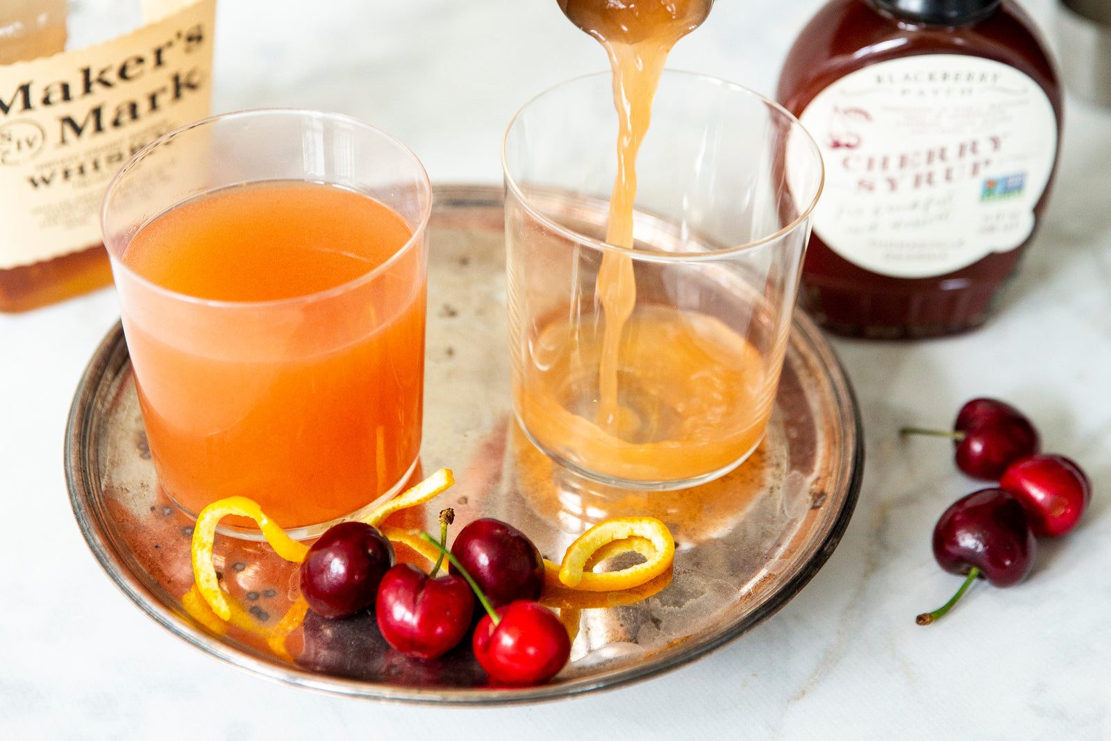 Add, bourbon, cherry syrup, orange bitters, club soda and ice to a cocktail shaker and shake until the container is cold. Pour shaken cocktail into your glasses. Top with an orange zest garnish and a cherry and enjoy!