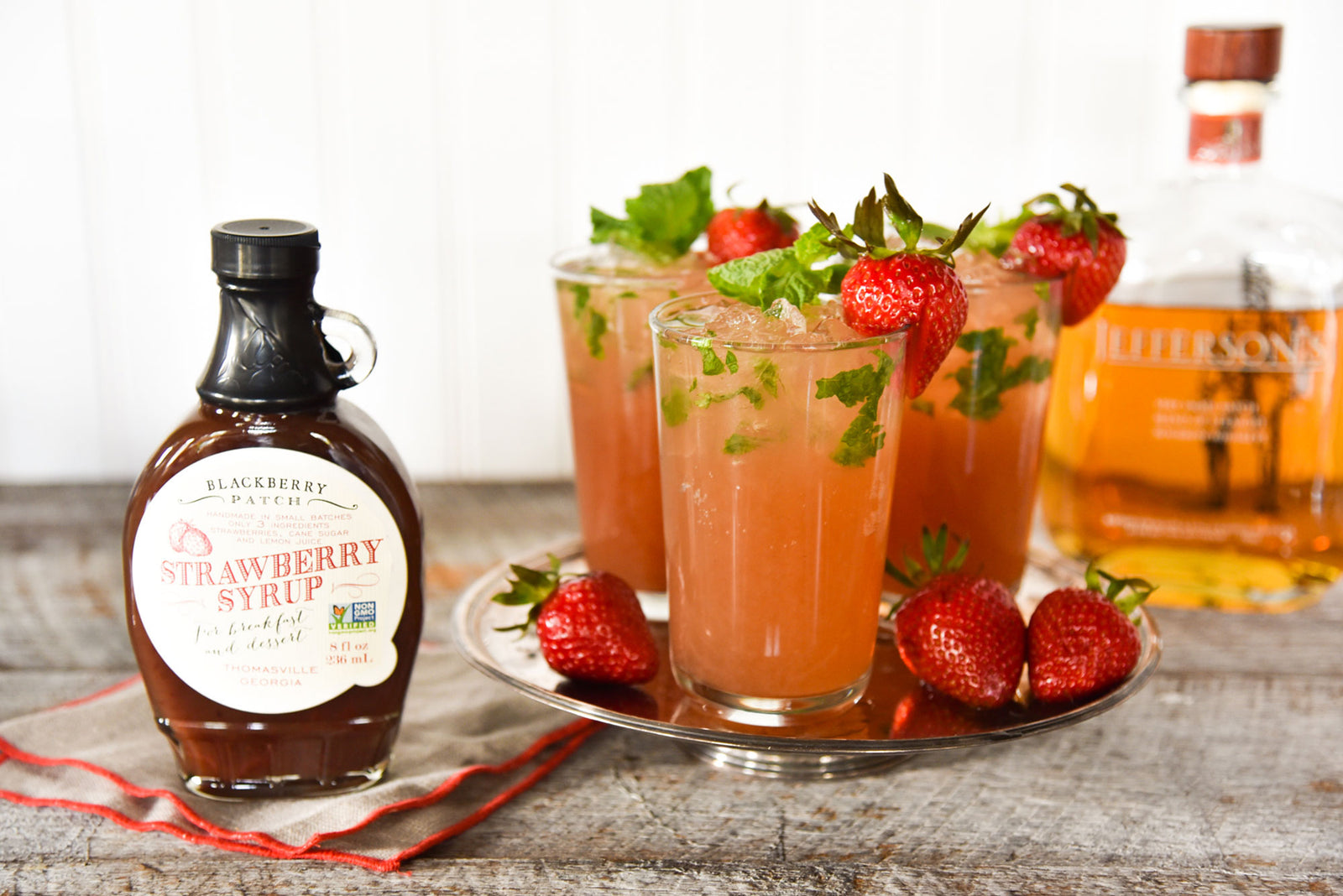 In a cocktail glass muddle the mint leaves and Blackberry Patch Strawberry Syrup. Add bourbon, sour mix, and club soda. Mix together. Add ice last. Garnish with a fresh strawberry and mint leaves.