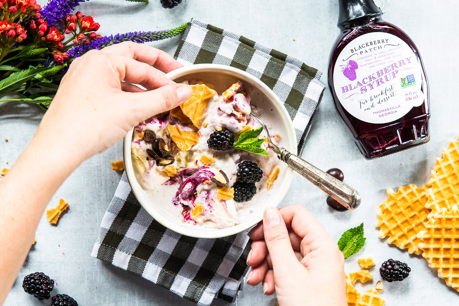 This is really a no-recipe recipe and a great way to utilize those pieces of broken waffle cone that come in every box! Just take a few scoops of your favorite ice cream, swirl in some Blackberry Syrup, add some waffle cone and any other toppings you fancy!