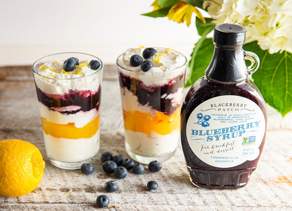 2. Layer whipped cream, lemon curd, and Blueberry Syrup to fill the glass. Garnish with lemons zest and fresh blueberries!