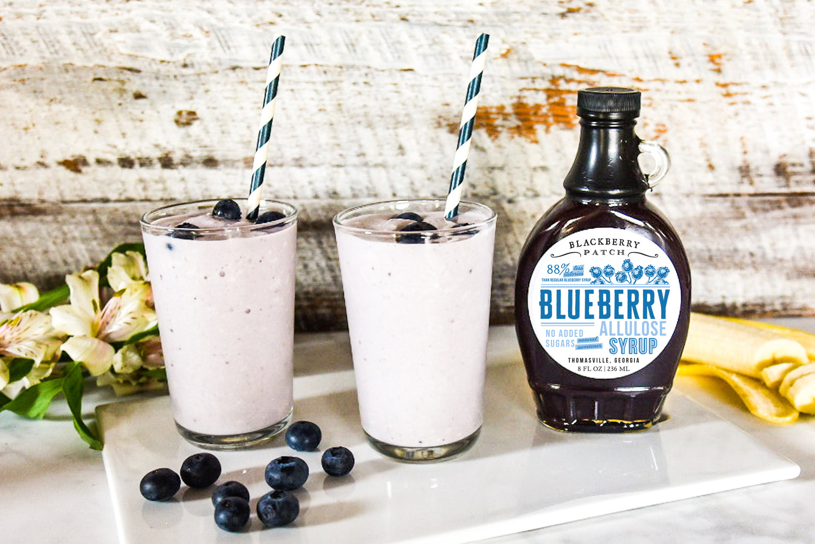 Blend frozen bananas, almond milk, almond butter and Blackberry Patch Blueberry Allulose Syrup until smooth. Top with fresh blueberries and enjoy!