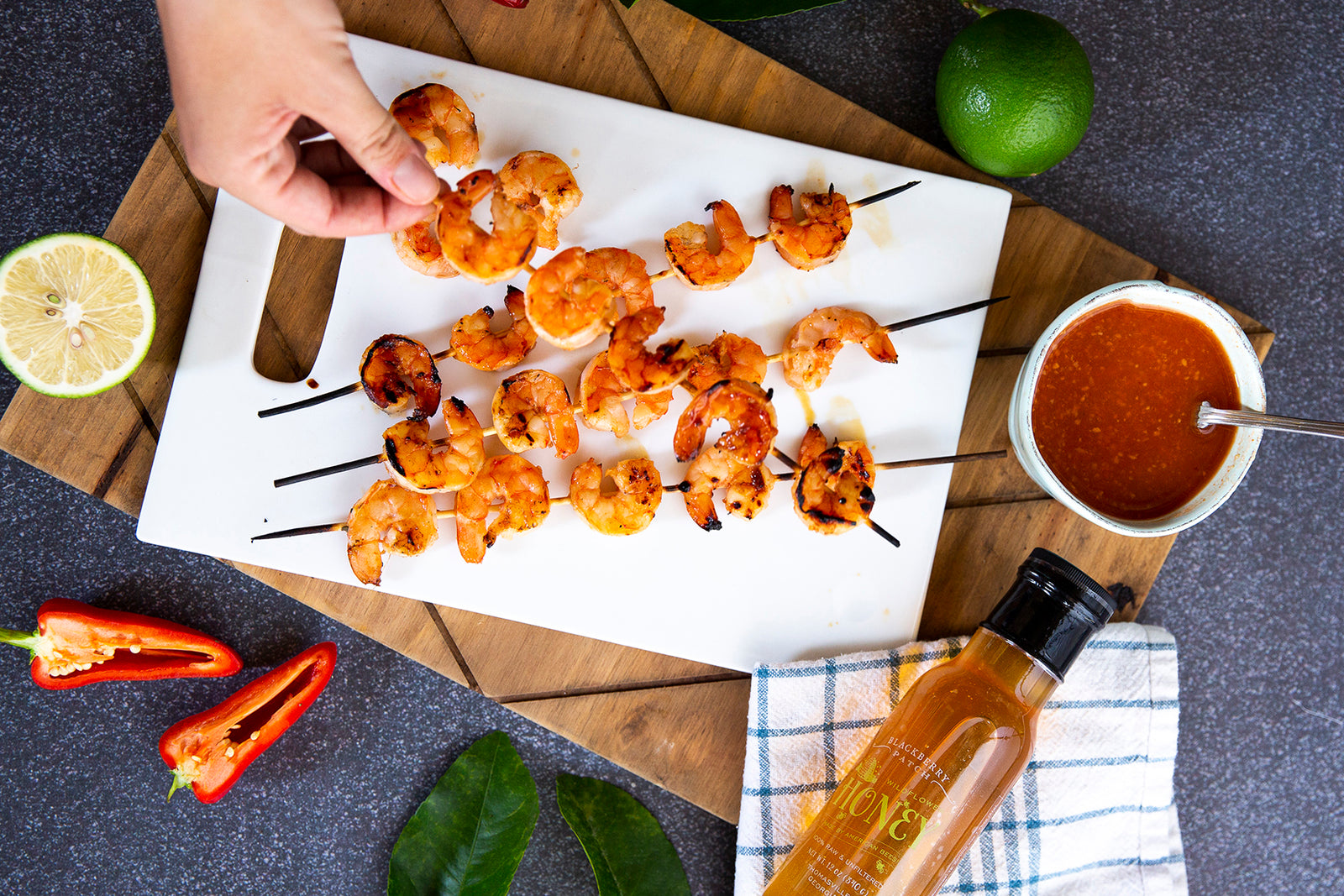 Combine all ingredients in a bowl and marinate shrimp for at least two hours. Grill on skewers for about 3 minutes per side until shrimp is done.
